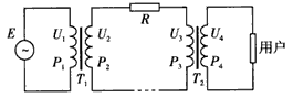 4、选择题 如图所示,有一台交流发电机E,通过理想升压变压器T1和理想降压变压器T2向远处用户供电,输电线的总电阻为R。T1的输入电压和输入功率分别为U1和P1,它的输出电压和输出功率分别为U2和P2;T2的输入电压和输入功率分别为U3和P3,它的输出电压和输出功率分别为U4和P4。设T1的输入电压U1一定,当用户消耗的电功率变大时,有