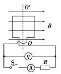 3、计算题 (10分)如图所示为交流发电机示意图,匝数为n=100匝的矩形线圈,边长分别为10cm和20cm,内阻为5Ω,在磁感应强度B=0.5 T的匀强磁场中绕OO′轴以50