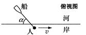 3、选择题 如图,人沿平直的河岸以速度行走,且通过不可伸长的绳拖船,船沿绳的方向行进,此过程中绳始终与水面平行。当绳与河岸的夹角为