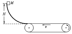 5、计算题 如图所示,质量M=20kg的物体从光滑曲面上高度H=0.8m处由静止释放,到达曲面底端时以水平方向的速度进入水平传送带。传送带由一电动机驱动,传送带的上表面匀速向左运动,运动速率为3.0m/s。已知物体与传送带间的动摩擦因数μ=0.10。(g取10m/s2)