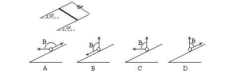 5、选择题  如图,两根倾斜的光滑导电轨道相互平行放置,轨道间接有电源。现将一根金属杆放于导电轨道上(与轨道保持垂直),同时加一匀强磁场,恰可使金属杆静止在轨道上,所加磁场的方向应在的范围为 [  ]