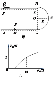 2、计算题 如图甲所示,BCD为竖直放置的半径R=0.20m的半圆形轨道,在半圆形轨道的最低位置B和最高位置D均安装了压力传感器,可测定小物块通过这两处时对轨道的压力FB和FD。半圆形轨道在B位置与水平直轨道AB平滑连接,在D位置与另一水平直轨道EF相对,其间留有可让小物块通过的缝隙。一质量m=0.20kg的小物块P(可视为质点),以不同的初速度从M点沿水平直轨道AB滑行一段距离,进入半圆形轨道BCD经过D位置后平滑进入水平直轨道EF。一质量为2m的小物块Q(可视为质点)被锁定在水平直轨道EF上,其右侧固定一个劲度系数为k=500N/m的轻弹簧。如果对小物块Q施加的水平力F≥30N,则它会瞬间解除锁定沿水平直轨道EF滑行,且在解除锁定的过程中无能量损失。已知弹簧的弹性势能公式,其中k为弹簧的劲度系数,x为弹簧的形变量。g取10m/s2。
