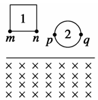 2、选择题 如图所示,用同种电阻丝制成的正方形闭合线框1的边长与圆形闭合线框2的直径相等.m和n是1线框下边的两个端点,p和q是2线框水平直径的两个端点.1和2线框同时由静止开始释放并进入上边界水平、足够大的匀强磁场中,进入过程中m、n和p、q连线始终保持水平.当两线框完全进入磁场以后,下面说法正确的是