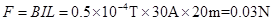 根据安培力的公式F=BIL的适用条件可知地磁场对这根导线的作用力大小为:F=BIL;