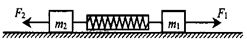 4、选择题 如图,两个质量分别为m1="3" kg、m2 = 2kg的物体置于光滑的水平面上,中间用轻质弹簧秤连接。两个大小分别为F1 =" 30" N、F2 =" 20" N的水平拉力分别作用在m1、m2上,则(?)