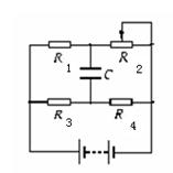 3、选择题 如右图所示的电路中,电阻R1=10Ω,R3=5Ω,R4=10Ω,电容器电容C=2μF,电源电动势E=15V,内阻不计,要使电容器不带有电,变阻器R2的阻值应调为(?)