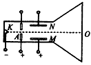 1、计算题 如图所示为一种测量电子比荷的仪器的原理图,其中阴极K释放电子,阳极A是一个中心开孔的圆形金属板,在AK间加一定的电压,在阳极右侧有一对平行正对带电金属板M、N,板间存在方向竖直向上的匀强电场。0点为荧光屏的正中央位置,且K 与0的连线与M、N板间的中心线重合。电子从阴极逸出并被AK间的电场加速后从小孔射出,沿KO连线方向射入M、N两极板间,已知电子从阴极逸出时的初速度、所受的重力及电子之间的相互作用均可忽略不计,在下列过程中,电子均可打到荧光屏上。