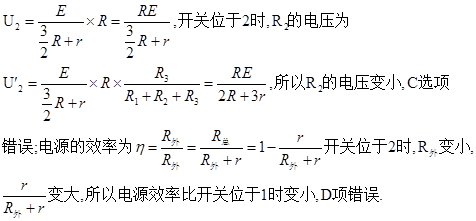本题解析:本题考查电路的动态分析,与一般的题目不同的是由于题目中各电阻均已知,所以可通过计算求解.设R1=R2=R3=R,开关S1在位置1时,电路的总电阻为(?R+r),当切换到2位置时,电路的总电阻为(?R+r),所以总电阻变小,总电流增大,路端电压U=E-Ir将变小,A项错误.电源内耗功率P=I2r将变大,B项正确;当开关位于1时, R2两端的电压为