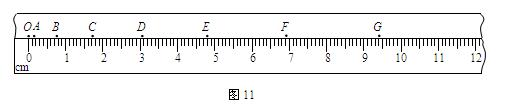 ②打点计时器接在频率为50Hz的交流电源上,图11为实验中打出的一条纸带,从起始点O开始,将此后连续打出的7个点依次标为A、B、C、D……。打点计时器打F点时,重物下落的速度为?m/s,该重物下落的加速度为 m/s2。(结果保留两位有效数字)