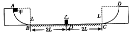 1、计算题 如图所示的凹形场地,两端是半径为L的光滑1/4圆弧面,中间是长为4L的粗糙水平面,质量为3m的滑块乙开始停在水平面的中点0处,质量为m的滑块甲从光滑圆弧面顶端A处无初速度滑下,进入水平面内并与乙发生碰撞,碰后以碰前一半的速度反弹。已知甲、乙与水平面的动摩擦因数分别为μ1,μ2且μ1= 2μ2。甲、乙的体积大小忽略不计,求: