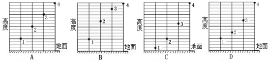 2、选择题 四个小球在离地面不同高度处,同时从静止释放,不计空气阻力,从某一时刻起每隔相等的时间间隔,小球依次碰到地面。则刚刚开始运动时各小球相对地面的位置可能是()