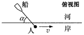 1、选择题 如图,人沿平直的河岸以速度v行走,且通过不可伸长的绳拖船,船沿绳的方向行进,此过程中绳始终与水面平行。当绳与河岸的夹角为α,船的速率为