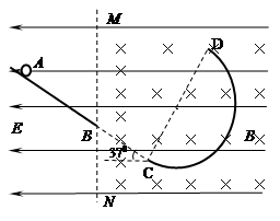4、计算题 如图所示,与水平面成37°倾斜轨道AB,其沿直线在C点与半径R=1m的半圆轨道CD相切,全部轨道为绝缘材料制成且放在竖直面内.整个空间存在水平向左的匀强电场,MN的右侧存在垂直纸面向里的匀强磁场.一个质量为m=0.4kg的带电小球从A点无初速开始沿斜面下滑,至B点时速度为