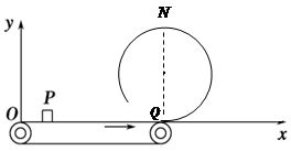 4、计算题 如图所示,x轴与水平传送带重合,坐标原点O在传送带的左端,传送带长L=8m,传送带右端Q点和竖直光滑圆轨道的圆心在同一竖直线上,皮带匀速运动的速度v0=5m/s。一质量m=1kg的小物块轻轻放在传送带上xP=2m的P点,小物块随传送带运动到Q点后恰好能冲上光滑圆弧轨道的最高点N点。小物块与传送带间的动摩擦因数μ=0.5,重力加速度g=10 m/s2。求: