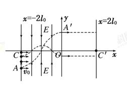 1、计算题 如图所示的直角坐标系中,在直线x=-2l0到y轴区域内存在着两个大小相等、方向相反的有界匀强电场,其中x轴上方的电场方向沿y轴负方向,x轴下方的电场方向沿y轴正方向。在电场左边界上A(-2l0,- l0)到C(-2l0,0)区域内,连续分布着电荷量为+q、质量为m的粒子。从某时刻起由A点到C点间的粒子,依次连续以相同的速度v0沿x轴正方向射入电场。若从A点射入的粒子,恰好从y轴上的A′(0,l0)沿x轴正方向射出电场,其轨迹如图虚线所示。不计粒子的重力及它们间的相互作用。求