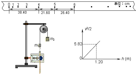 2、实验题 用如图实验装置验证m1 、m2组成的系统机械能守恒。m2从高处由静止开始下落,m1上拖着的纸带打出一系列的点,对纸带上的点迹进行测量,即可验证机械能守恒定律。下图给出的是实验中获取的一条纸带:0是打下的第一个点,每相邻两计数点间还有4个点(图中未标出),计数点间的距离如图所示。已知m1=50g 、m2=150g ,则(g取10m/s2,结果保留两位有效数字)