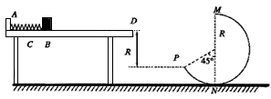 1、计算题 如图所示,水平桌面上有一轻弹簧,左端固定在A点,自然状态时其右端位于B点。水平桌面右侧有一竖直放置的光滑轨道MNP,其形状为半径R=0.8m的圆环剪去了左上角135°的圆弧,MN为其竖直直径,P点到桌面的竖直距离也是R。用质量m=0.2kg的物块将弹簧缓慢压缩到C点,BC间光滑,由静止释放,物块过B点后其位移与时间的关系为
