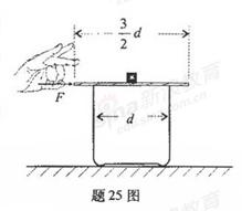 1、计算题 某兴趣小组用如题25图所示的装置进行实验研究。他们在水平桌面I固定一内径为d的椭圆形玻璃杯,杯口I放置一直径为d ,质量为m 的均匀薄圆板,板内放一质量为2m的物块。板中心,物块均在杯的轴线,则物体与板间动摩擦因数为c,不考虑板与杯口之间的摩擦力,重力加速度为g,不考虑板翻转。
