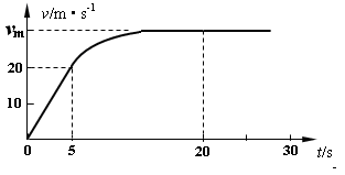 5、简答题 一新车型赛车沿倾角为θ=370的专用长斜坡测试道进行测试,该车总质量为m=1t,由静止开始沿长斜坡向上运动,传感设备记录其运动的速度-时间图象(v-t图象)如图.该车运动中受到的摩擦阻力(含空气阻力)恒定,且摩擦阻力跟对路面压力的比值为μ=0.25.0~5s的v-t图线为直线,5s末起达到该车发动机的额定牵引功率并保持该功率行驶,在5s~20s之间,v-t图线先是一段曲线,后为直线.取g=10m/s2,.求: