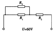 4、计算题 如图所示的电路中,电阻R1=4 kΩ,R2=6 kΩ,电路两端所加的电压U=60 V,用某电压表测得R1两端电压为20 V,试求该电压表的内阻。