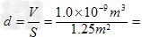 3、计算题 一滴油在水面上形成的油膜的最大面积是1.25m2.若油滴原来的体积是1.0mm3,密度为0. 86×103kg/m3,此种油的摩尔质量为131.3g/mol,试估算阿伏加德罗常数.(取两位有效数字)
