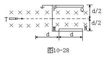 4、简答题 初速度为零的离子经过电势差为U的电场加速后,从离子枪T中水平射出,与离子枪相距d处有两平行金属板MN和PQ,整个空间存在一磁感强度为B的匀强磁场如图10-28所示。不考虑重力的作用,荷质比q/m(q,m分别为离子的带电量与质量),应在什么范围内,离子才能打到金属板上?