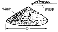 5、计算题 如图所示,用传送带在空地上堆小钢片,允许堆放的场地直径是20m,问堆起的最大高度是多少?(钢与钢之间动摩擦因数0.1~0.25)
