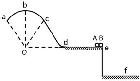 1、计算题 (18分)如图,竖直固定轨道abcd段光滑,长为L=1.0m的平台de段粗糙,abc段是以O为圆心的圆弧.小球A和B紧靠一起静止于e处,B的质量是A的4倍.两小球在内力作用下突然分离,A分离后向左始终沿轨道运动, 与de段的动摩擦因数μ=0.2,到b点时轨道对A的支持力等于A的重力的, B分离后平抛落到f点,f到平台边缘的水平距离S= 0.4m,平台高h=0.8m,g取10m/s2,求: