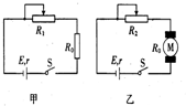 1、选择题 如图所示电路中电动势E=12V,内阻r=3Ω,R0=1Ω,直流电动机的内阻R′0=1Ω.对甲电路,调节滑动变阻器使其接入电阻为R1时可使电路中电源的输出功率最大;对乙电路,调节滑动变阻器使其接入电阻为R2时可使电路中电源的输出功率最大,且电动机刚好正常工作,电动机额定输出功率P0=2W.由题中信息可知R1和R2的阻值分别为( )