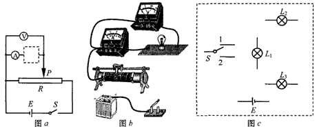 现有如下器材:电源E(6V,内阻不计),灯泡L1(6V,1.5W)、L2(6V,10W),L3(6V,10W),单刀双掷开关S。在图(c)中设计一个机动车转向灯的控制电路:当单刀双掷开关S与1相接时,信号灯L1亮,右转向灯L2亮而左转向灯L3不亮;当单刀双掷开关S与2相接时,信号灯L1亮,左转向灯L3亮而右转向灯L2不亮。