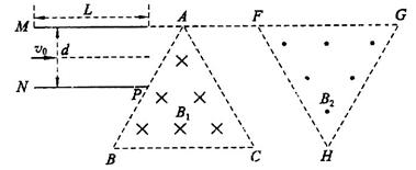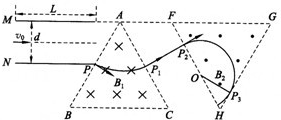 ;在平行金属板右侧依次存在ABC和FGH两个全等的正三角形区域,正三角形ABC内存在垂直纸面向里的匀强磁场Bl,三角形的上顶点A与上金属板M平齐,BC边与金属板平行,AB边的中点P恰好在下金属板N的右端点;正三角形FGH内存在垂直纸面向外的匀强磁场B2,已知A、F、G处于同一直线上,B、C、H也处于同一直线上,AF两点距离为