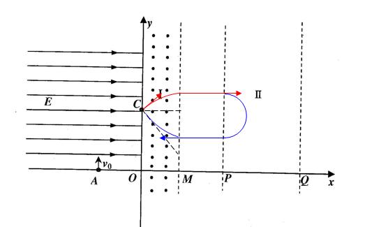 2、计算题 如图所示,在直角坐标系xoy的第一、四象限区域内存在两个有界的匀强磁场:垂直纸面向外的匀强磁场I以及匀强磁场Ⅱ,O、M、P、Q为磁场边界和x轴的交点,MP区域是真空的,OM=MP=L。在第二象限存在沿x轴正向的匀强电场.一质量为m带电量为+q的带电粒子从电场中坐标为(-L,O)的点以速度v0沿+y方向射出,从y轴上坐标(O,2L) 的C处射入区域I,并且沿x的正方向射出区域I,带电粒子经过匀强磁场Ⅱ后第二次经过y,轴时就回到C点(粒子的重力忽略不计).求: