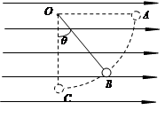 1、计算题 (8分)如图所示,在沿水平方向的匀强电场中有一固定点O,用一根长度为l=0.20m的绝缘轻线把质量为m=0.10kg、带有正电荷的金属小球悬挂在O点,小球静止在B点时轻线与竖直方向的夹角为θ=37°。现将小球拉至位置A,使轻线水平张紧后由静止释放。g取10m/s2,sin37°=0.60,cos37°=0.80。求: