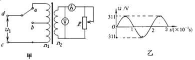 4、选择题 如图甲所示,理想变压器原副线圈的匝数比为10:1,b是原线圈的中心抽头,图中电表均为理想的交流电表,定值电阻R=10Ω,其余电阻均不计.从某时刻开始在原线圈c、d两端加上如图乙所示的交变电压。则下列说法中正确的有