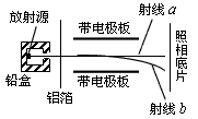 3、填空题 一置于铅盒中的放射源发射的α、β和γ射线,由铅盒的小孔射出,在小孔外放一铝箔后,铝箔后的空间有一匀强电场。进入电场后,射线变为a、b两束,射线a沿原来方向行进,射线b发生了偏转,如图所示,则图中的射线a为______射线,射线b为_____射线。