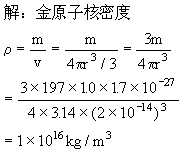 5、简答题 实验测得,在α粒子散射实验中,α粒子与金原子核对心运动时,α粒子所能达到的最近距离是2×m.由此估算一下金原子核的密度是多大?(1u=1.7×