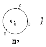 5、选择题 如图2所示,在O点置一点电荷Q,以O为圆心作一圆。现将一电荷从A分别移到圆上的B、C、D三点,则电场力做功最多的过程是:( )