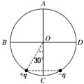 2、计算题 (8分)如图所示,AC、BD为圆的两条互相垂直的直径,圆心为O,半径为r,将带等电荷量的正、负点电荷放在圆周上,它们的位置关于AC对称,+q与O点的连线和OC夹角为30°,求 O点处的场强?