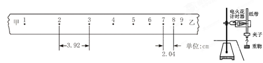 (2)从图上看出,从乙端往甲端,相邻的计数点距离越来越大,也就说明纸带速度越来越大.由于重物下落速度逐渐变大,所以打点计时器先打出9点,而与重物相连的纸带一端在实验时是处于下端,也就是计时器先打点的位置,所以纸带的乙端与重物相连.