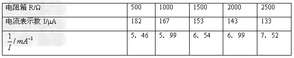 b.如图,是一正在测量中的电阻箱示意图,则该电阻箱的读数为____________Ω。 c.下表为某次实验的数据根据表中数据在坐标纸中作出 关系图像如图所示,根据图像可以得水果电池的内阻r为? ,电动势E为?。