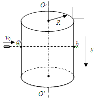 3、计算题 如图所示,图中的装置可测量子弹的速度,其中薄壁圆筒半径为R,圆筒上的a、b两点是一条直径上的两个端点(图中OO′为圆筒轴线)。圆筒以速度v竖直向下匀速运动。若某时刻子弹沿图示平面正好水平射入a点,且恰能经b点穿出。