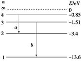 4、选择题 (2011年龙岩质检)如图15-2-8所示为氢原子的能级图.当氢原子从n=4的能级跃迁到n=2的能级时,辐射出光子a;当氢原子从n=3的能级跃迁到n=1的能级时,辐射出光子b,则下列判断正确的是( )