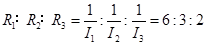 4、选择题 已知通过三个并联支路的电流之比是I1∶I2∶I3=1∶2∶3,则三个并联支路的电阻之比R1∶R2∶R3为( )