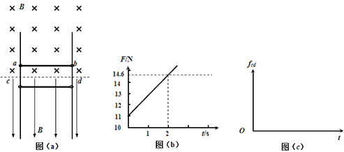 2、计算题 相距L=1.5m的足够长金属导轨竖直放置,质量为m1=1kg的金属棒ab和质量为m2=0.27kg的金属棒cd均通过棒两端的套环水平地套在金属导轨上,如图(a)所示,虚线上方磁场方向垂直纸面向里,虚线下方磁场方向竖直向下,两处磁场磁感应强度大小相同。ab棒光滑,cd棒与导轨间动摩擦因数为μ=0.75,两棒总电阻为1.8Ω,导轨电阻不计。ab棒在方向竖直向上,大小按图(b)所示规律变化的外力F作用下,从静止开始,沿导轨匀加速运动,同时cd棒也由静止释放。(g=10m/S2)