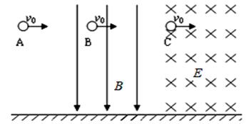 水平抛出,B球处于竖直向下的匀强磁场中,C球处于垂直纸面向里的匀强电场中,它们落地的时间分别为