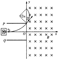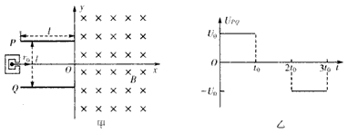 4、计算题 如图甲所示,建立Oxy坐标系,两平行极板P、Q垂直于y轴且关于x轴对称,极板长度和板间距均为l,第一、四象限有磁场,方向垂直于Oxy平面向里。位于极板左侧的粒子源沿x轴向右接连发射质量为m、电荷量为+q、速度相同、重力不计的带电粒子,在0-3t0时间内两板间加上如图乙所示的电压(不考虑极板边缘的影响)。已知t=0时刻进入两板间的带电粒子恰好在t0时刻经极板边缘射入磁场,上述m、q、l、t0、B为已知量。(不考虑粒子间相互影响及返回板间的情况)