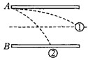 1、计算题 如图所示,有一带电粒子(不计重力)紧贴A板沿水平方向射入匀强电场,当偏转电压为U1时,带电粒子沿轨迹①从两板正中间飞出;当偏转电压为U2时,带电粒子沿轨迹②落到B板中间。设两次射入电场的水平速度相同,试求:两次的电压之比U1:U2。