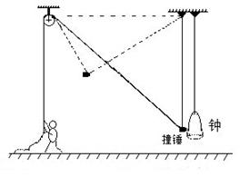 3、选择题 如图所示,在一座寺庙门口吊着一口大钟,在大钟旁边并排吊着撞锤,吊撞锤的轻绳长为L,与吊撞锤的点等高且水平相距处有一固定的光滑定滑轮,一和尚将轻绳一端绕过定滑轮连在撞锤上,然后缓慢往下拉绳子另一端,使得撞锤提升竖直高度L/2时突然松手,使撞锤自然的摆动下去撞击大钟,发出声音。(重力加速度g)则
