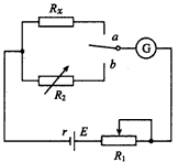 参考答案:(1)第一步:将开关打到a位置闭合,适当调节滑动变阻器R1,使电流表指针指到某一位置;第二步:将开关打到b位置闭合,调节变阻箱R2,使电流表指针指到原来位置,读出此时变阻箱R2接入电路的电 阻值R,即为待测电阻阻值