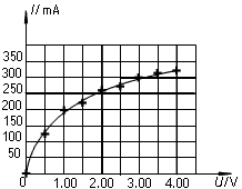 (3)利用实验中得到实验数据在下图所示的I-U坐标系中,描绘得出了小灯泡的伏安特性曲线。根据此图给出的信息,若把该灯泡接到一个电动势为3.0伏,内阻为10Ω的直流电源时,小灯泡消耗的实际功率约为______________。(结果保留两位有效数字)